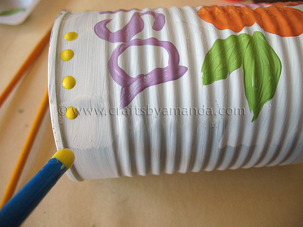 - Paint the outside and bottom of the can with a light color. Use colorful paint to decorate the can; round applicators work great for flowers.