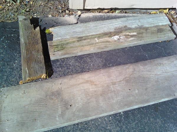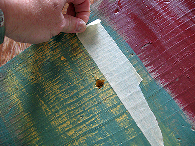 A cool distressing technique I learned from Donna’s post on creating old signs (above) was to use masking tape on the paint before it’s fully cured.