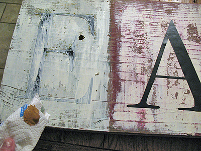 - Now that there are two layers on each section, you will want to let it dry a bit so you can sand it. In case you are wondering why I used a reversed stencil technique here, it’s because I wanted to preserve the colors you see above in the actual letters, just like in the Pier 1 sign.