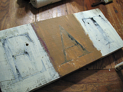 Next was the second coat, which needs to be a contrasting color. Because I wanted my sign to end up as light, dark, light, I also had to start that way. Therefore, the second layer was dark, light, dark, from left to right. Just dry brush it on, leaving some parts uncovered or not covered as heavily.