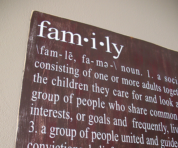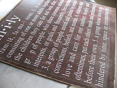 I had a space to fill on my living room wall, a piece of plywood, some paint and a cool piece of vinyl I bought with the definition of family on it. Because the other things hanging on that wall are dark brown, I decided to distress the wood with some dark brown and burgundy red. This makes a great addition to the wall and the definition of family fits perfectly in the room we spend so much time in.