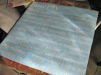 Position the vinyl on your sign board, again with the help of a friend if possible. You’ll want to hover it over the board until you are ready to set it down as it may stick once set in place. If any letters came off during the peeling process, just carefully set them aside and add them last (see the word “group” fourth line down from the top?). Use your straight edge to rub the vinyl letters onto your board, rolling the backing back off as you go until all the letters are stuck to the board.