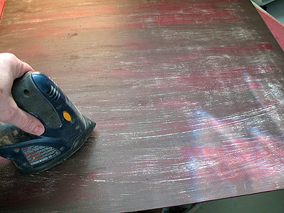 - Using my handy dandy Ryobi sander and a medium grit sandpaper, using a light hand sand the surface, going with the grain of the brushstrokes. You’ll want to sand off the color in some areas down to the white, and in other areas just lightly. There’s no perfect science to it, just sand until you’re happy with it.