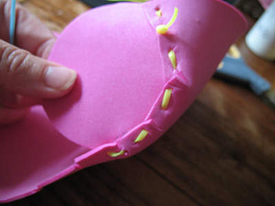 - Thread a long piece of lanyard onto a child safe sewing needle. Sew the round piece of foam to the rectangular piece of foam, using the slits to work around the circle.