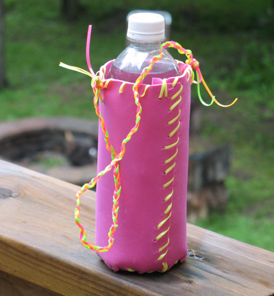 Optional: Lanyard and craft foam come in a variety of colors to suit both boys and girls. Craft foam stickers are also available in a wide variety of shapes and sizes. Boys make like frogs and snakes while girls will be more partial to flowers and hearts. Alternatively, the bottle holder can be left blank or decorated with markers before sewing together.