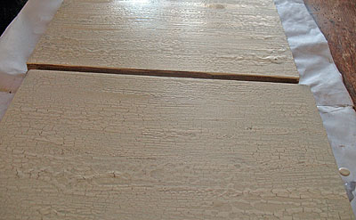Paint the plywood brown, paint the sides as well. Allow to dry. When the brown paint is dry, brush on a coat of crackle medium. This will need to dry for a good 30-40 minutes. You don’t want it to dry completely, but almost. ;)