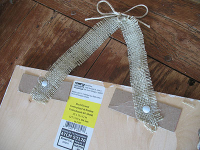 - To add hangers, cut a piece of burlap into a 12-14″ strip, fray the edges by pulling off a couple side strands. Position the fruit art on your work surface facing up, then position your hanger under it, just to figure out how you want it. When you have it the way you want it, tie a piece of twine at the top of the hanger into a bow, trim ends. Use your glue gun to tack the burlap to some pieces of cardboard, and tack the cardboard to the wooden board. Now you can lift the art and turn it over without losing the hanger’s position. Add more hot glue where needed and push thumbtacks into the burlap and cardboard for a little added strength.