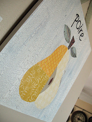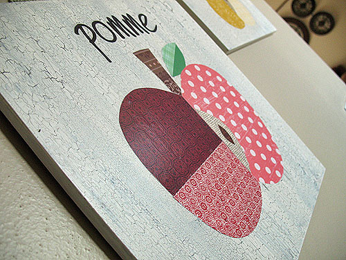 There’s a little story behind this wall art. I was selected as a contestant, along with 11 incredibly talented ladies in the super fun competition, Crafting with the Stars. I was paired up with Amy Anderson of Mod Podge Rocks fame, and together we were to come up with a brand inspired decoupage knock off project. We both had a few different ideas, but I decided that the apple and pear wall art from Land of Nod that Amy found could be transformed into some fabulous kitchen wall art. I had originally planned to just put “apple” and “pear” above the fruit, but the amazing Amy suggested writing the words in French. Tres bon!! The French are all about food, so it only made sense to put the words of my kitchen foodie wall art in the language of love. :)