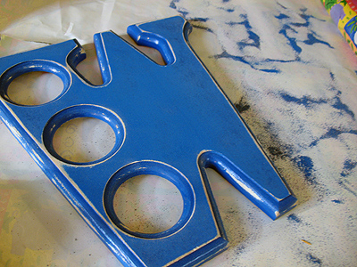 - I started by sanding off the shiny finish on the blue paint with a power sander. I made sure to sand down to the bare wood around all the edges. I knew that I wanted black to show on the edges, not blue, so I was sure to get rid of that.