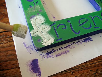 - Place the "Friends" stencil on top of the painted frame. I secured mine to the side with a little tape. Dip applicator in white paint and pounce off the excess paint onto a paper towel. Hold the stencil down with your fingers and pounce applicator onto the stencil. When stenciling, remember to pounce your applicator straight up and down and not at an angle. Pouncing at an angle can cause the paint to get under the stencil. When finished, lift the stencil off the frame and wait for the wait paint to dry before moving on to the next step.