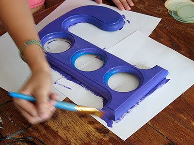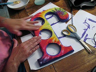 She chose a tie dye shirt she had in her closet and we went to work. First we removed the glass and then she sanded the frame a bit to rough it up and remove the shiny finish. Next she gave it a coat of purple paint.