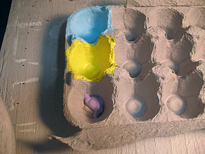 - Paint the cardboard egg cartons inside and out. Use fun colors like yellow, pink, red, purple and light blue. Let dry. When dry cut out and trim.